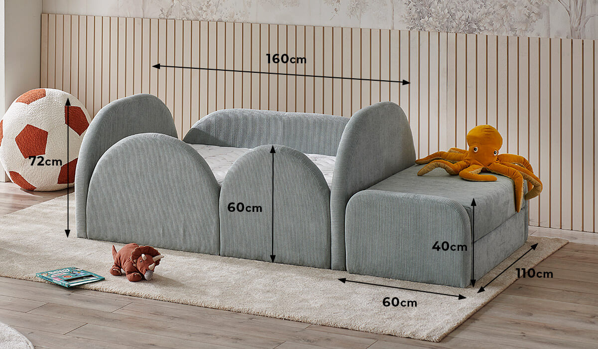 Yatak, tek bir parça olarak kullanılabildiği gibi, L şeklinde bir dinlenme ve oyun alanı olarak da düzenlenebilir.