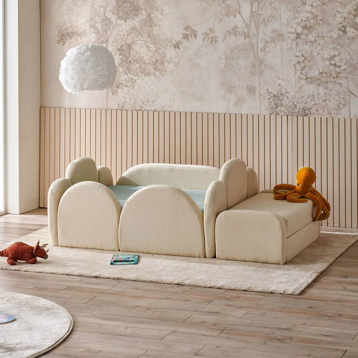 Bulut ve dalgalı hatlardan ilham alan tasarımı, çocuk odasına sevimli ve modern bir hava katar.