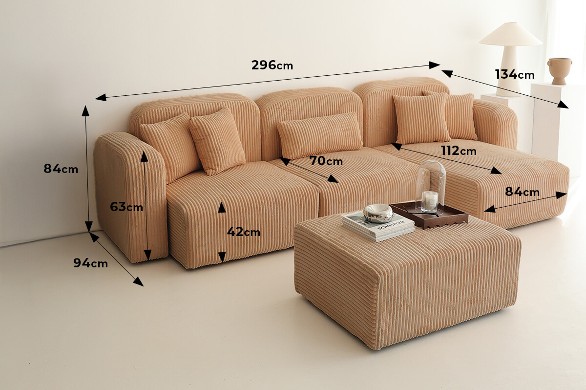 Yenilikçi yuvarlak hatlı tasarımıyla CUBO Modüler Köşe Koltuk. Pet ailelerin de bayılacağı kalın fitilli yeni nesil kumaş hem sizi sarmalayacak kadar yumuşak hem de pet-friendly. Sık dokuma bu yeni nesil kumaş dokusuyla kadifeyi anımsatsa da bildiğiniz kadife kumaşlar gibi terletme ve parlama yapmaz. Nemli bir bezle kolaylıkla temizlenebilir.