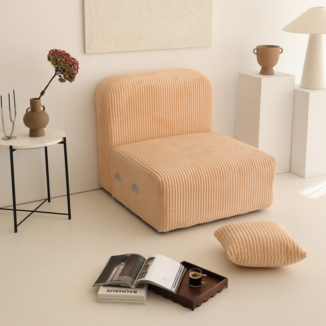 evodeko CUBO Modüler Koltuk istediğiniz kumaşla kişiselleştirilebilir. Makaslı ve kancalı tasarımı sayesinde tek başınıza kolay ve hızlı şekilde kurulur.