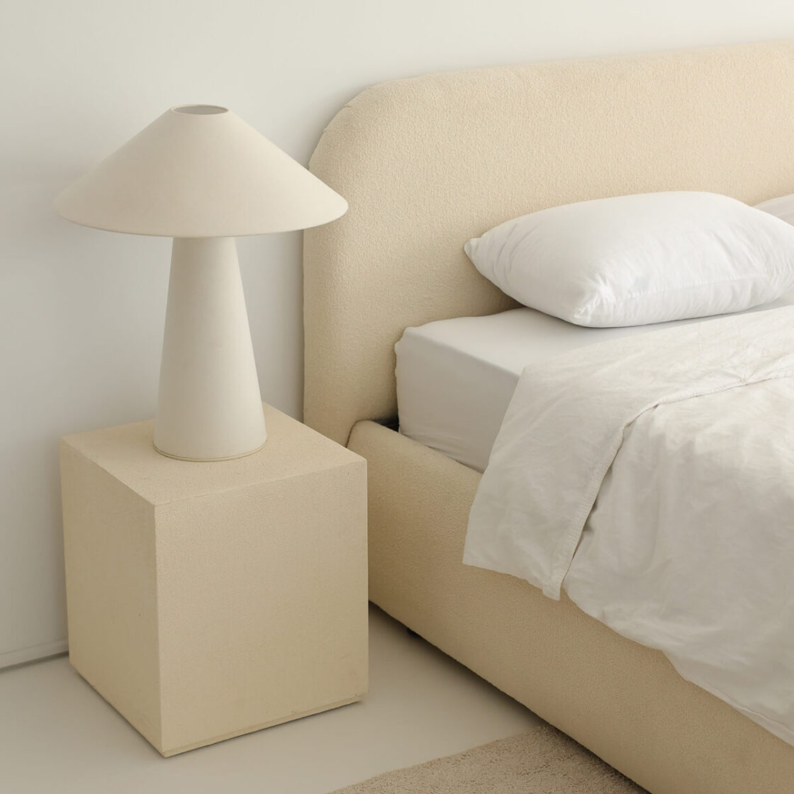 Baza ve başlığın yuvarlak hatlarını tamamlayan teddy bukle kumaşla GOYA evinizin en konforlu ve şık detaylardan biri olmaya hazır.