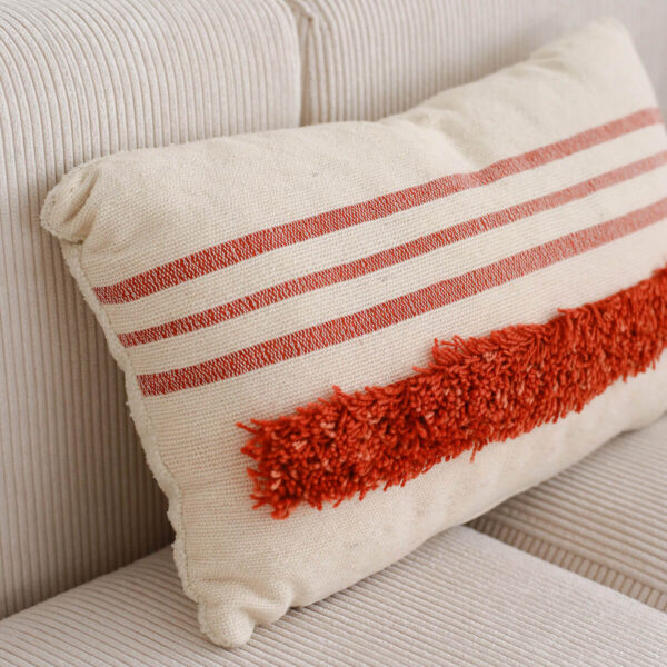 Kırlentin ön yüzü doğal boyalar ve %100 doğal yün kullanılarak elde dokunmuştur. Arka tarafı %100 coton kumaş ile hazırlanmıştır ve fermuarlıdır.
