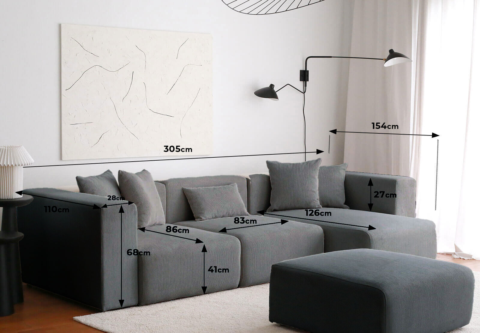 YOLO Modüler Köşe Koltuk ister sağ isterseniz sol köşe olarak kullanılabilir. Evde değişebilecek ihtiyaçlarınıza göre değişerek dekorasyona uyum sağlar. Kırlentlerle beraber gönderilmektedir. YOLO Puf ekstra satın alınarak takıma eklenebilir.